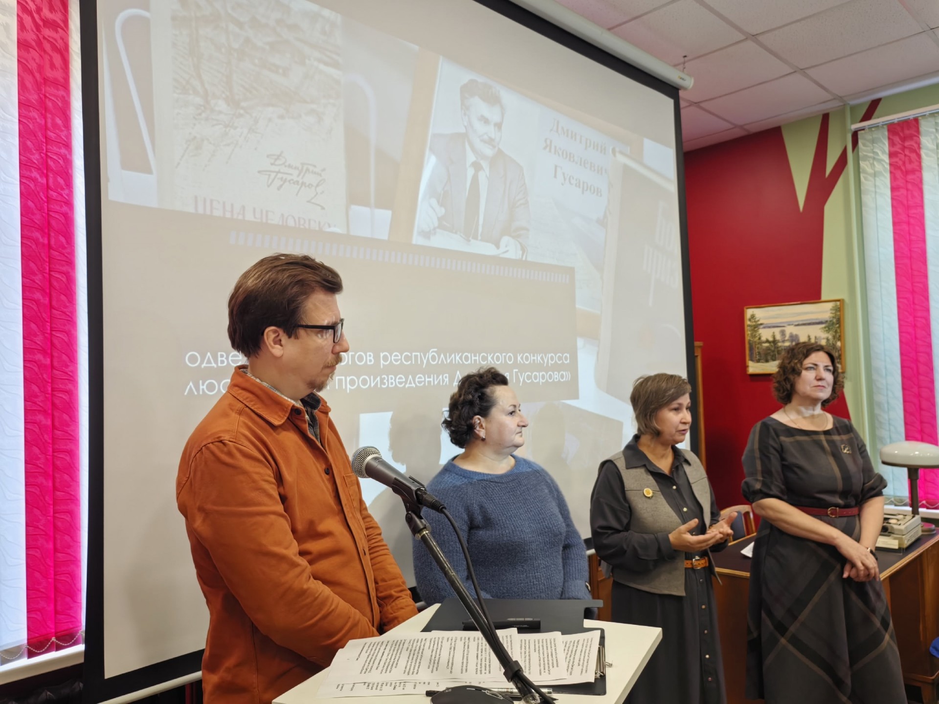 Затем прошло награждение участников конкурса «Иллюстрируем произведения Дмитрия Гусарова», который стартовал 23 февраля 2025 года в рамках проекта «Боевой призыв: 100-летие Д. Я. Гусарова». В фойе библиотеки представлена выставка живописных и графических работ, иллюстрирующих рассказы «Банка консервов», «Путь в отряд» и роман-хронику «За чертой милосердия».